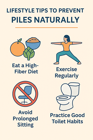Preventing piles starts with a few simple lifestyle changes. A high-fiber diet, regular water intake, and daily exercise can significantly reduce your risk. Avoid sitting for long periods—especially on the toilet—and never ignore the urge to pass stool. Practicing yoga and deep breathing helps improve digestion and reduce pressure in the rectal area. Small changes like switching to whole grains and using a footstool while sitting on the toilet can also help. Prevention is easier than treatment—be kind to your digestive system every day